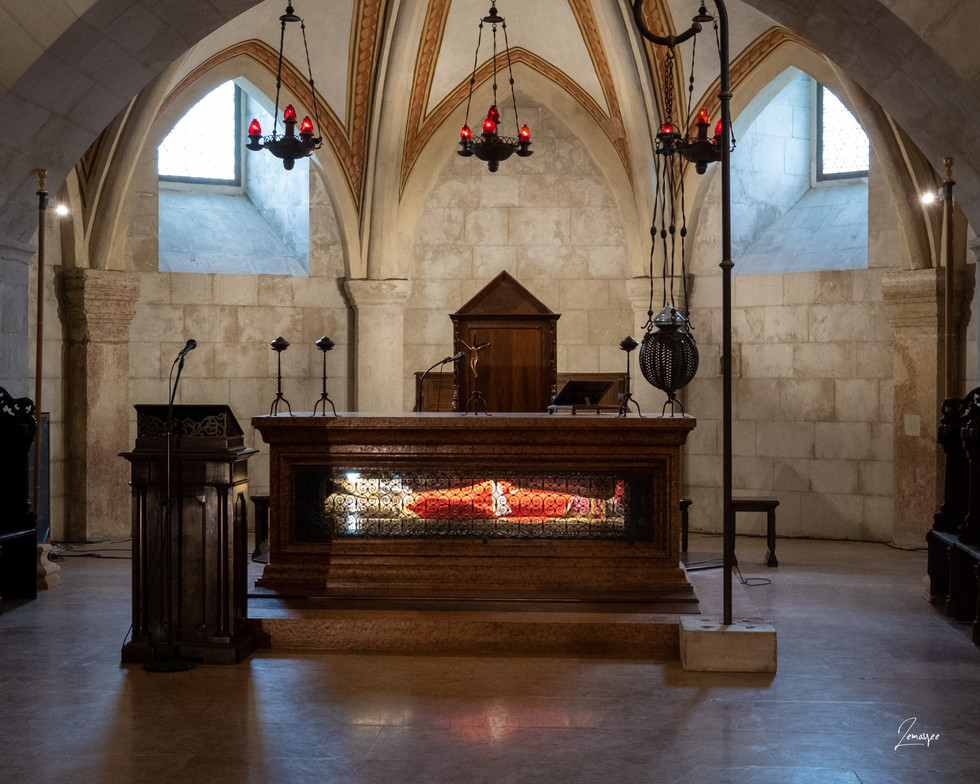 The Basilica has a beautiful courtyard and the interior of the church is on three levels with an extensive crypt on the lower level, the church proper and a raised presbytery. Since 921, the crypt has housed the body of St. Zeno in a sarcophagus, his face covered by a silver mask. The crypt has a nave with eight aisles the arches of which are supported by 49 columns, each having a different capital.